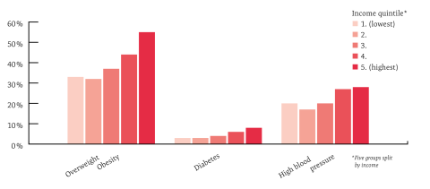 Übergewicht und Fettleibigkeit – wichtige Risikofaktoren für Herz-Kreislauferkrankungen und Diabetes – sind stark verbreitet. Die Erhebung hat gezeigt, dass fehlende Bewegung bei Frauen und Männern sowie ungesunde Ernährung verbreitet sind.